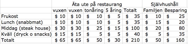 Som framgår är det parkbiljetter, mat och boende som blir den största kostnaden och där man kan påverka totalkostnaden mest. Boendepriserna varierar kraftigt över året och kan man undvika skolloven finns mycket pengar att spara. Fungerar det dessutom inte med att max 4 personer delar på två sängar så kan boendekostnaden fördubblas.